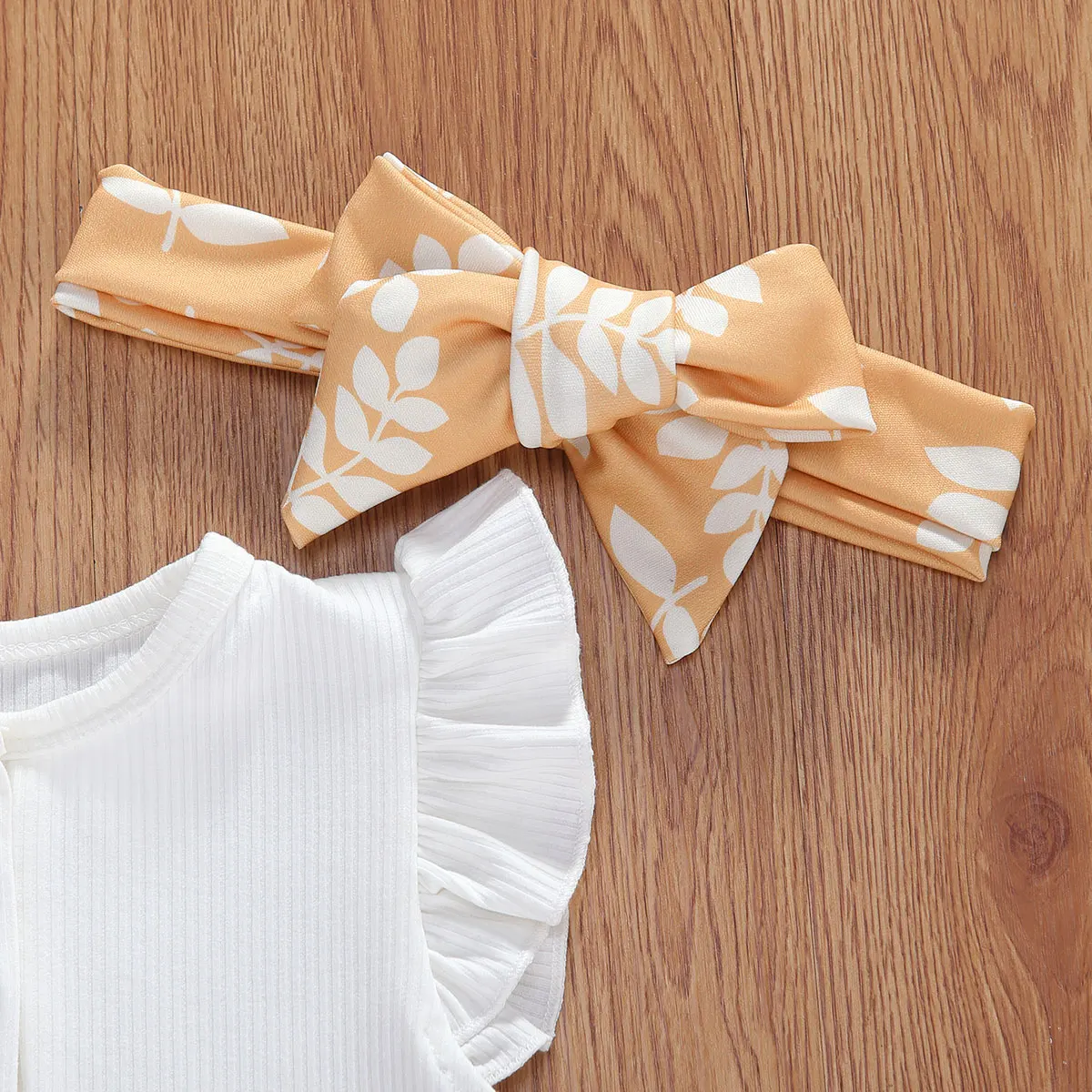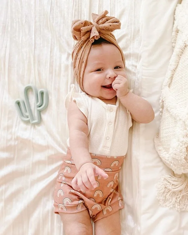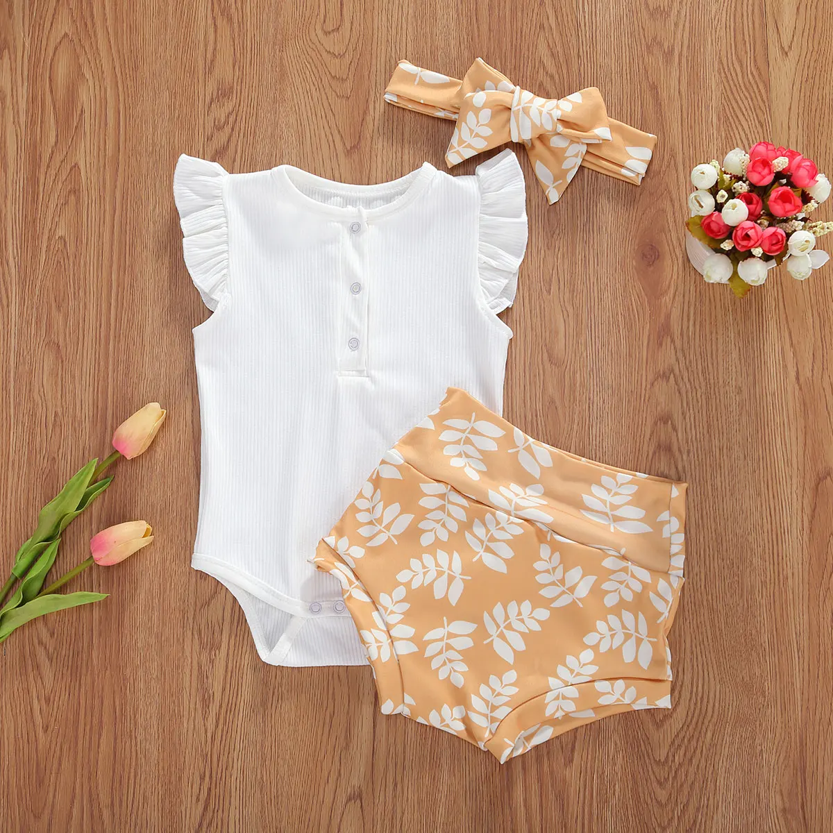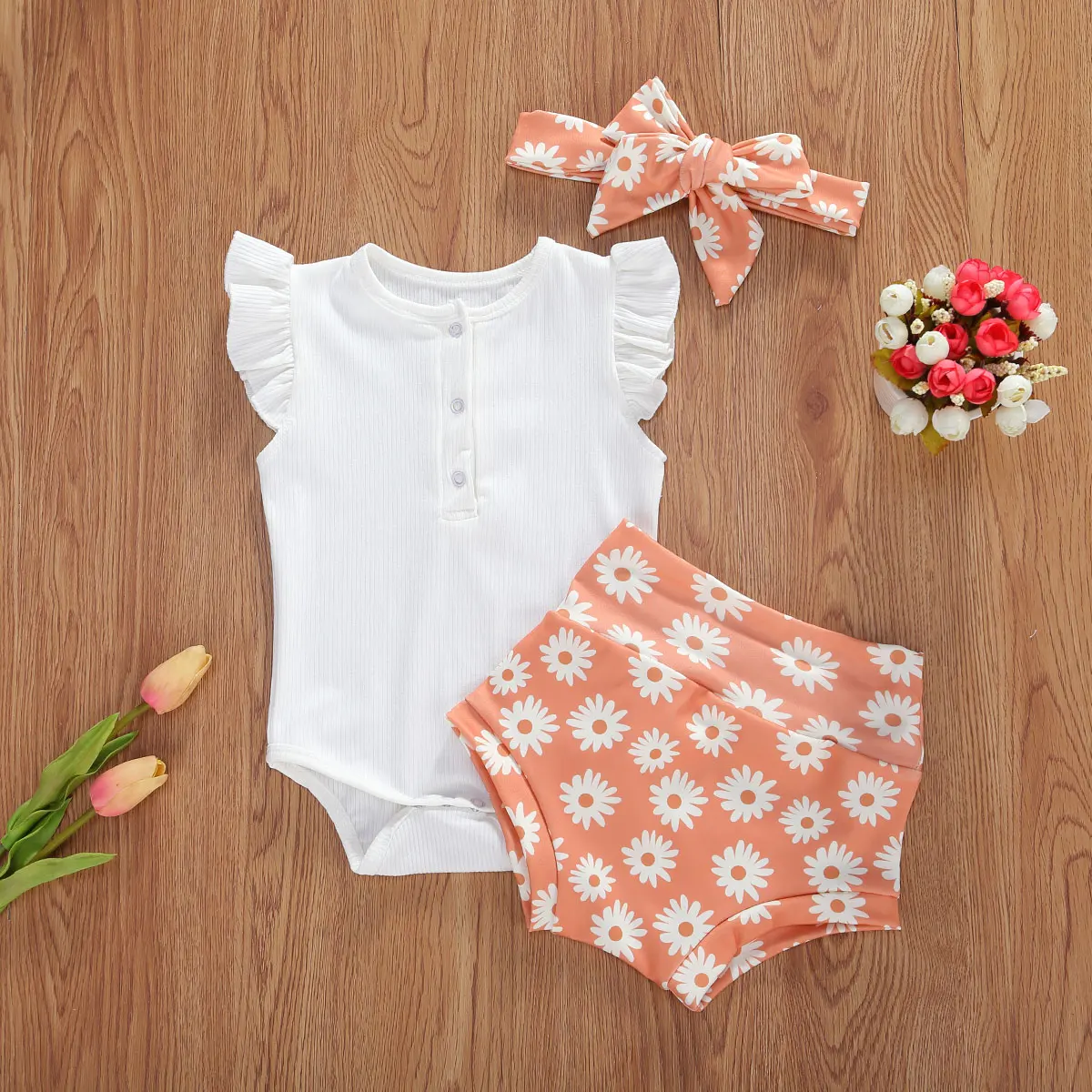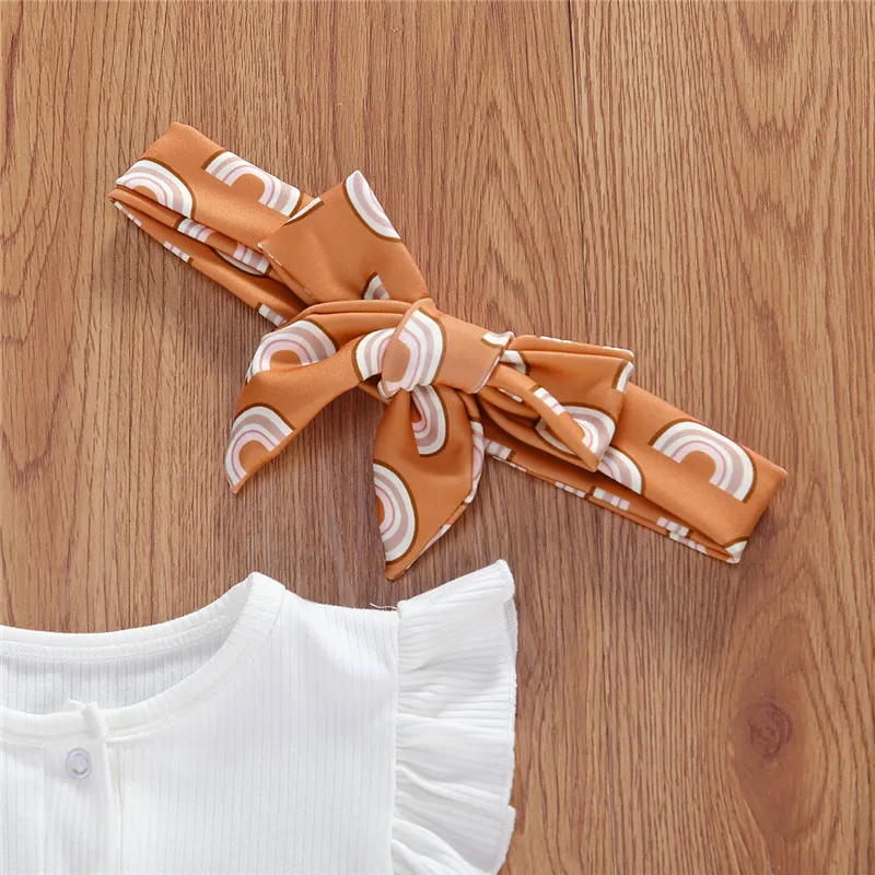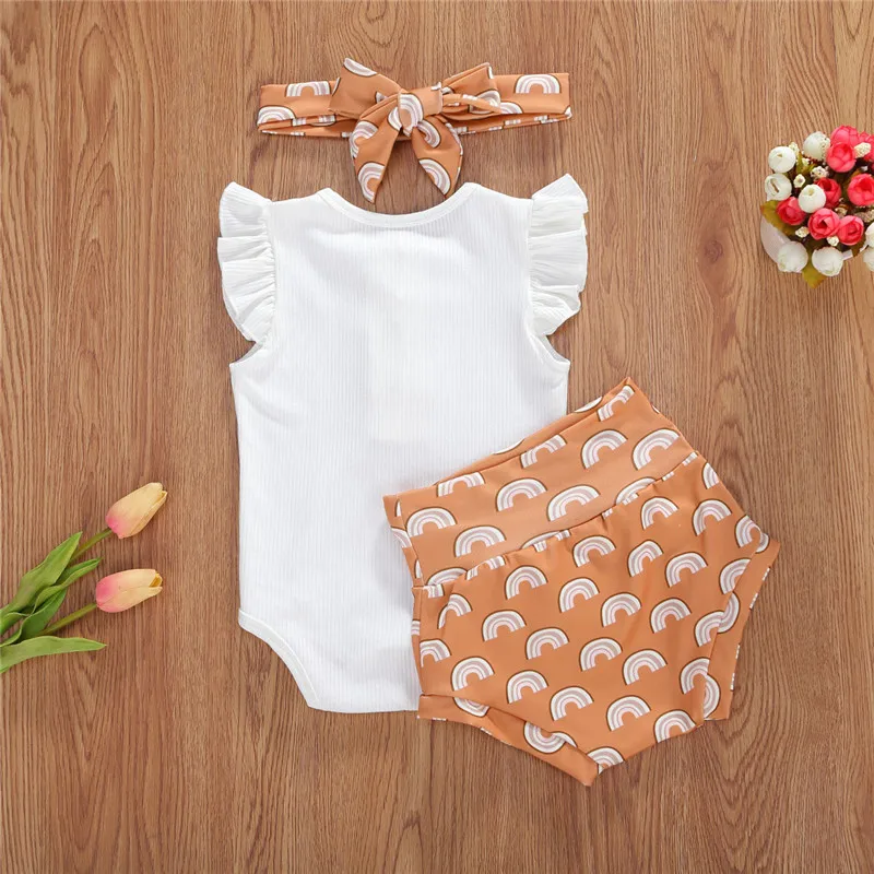 How lovely these rompers are. It has a neutral color and perfect for your little one. The white romper is a perfect match for the printed shorts. It comes in three designs and a ribbon headband that matches the shorts. Its romper has a round neck collar and has buttons on the front and ruffles sleeves to add vibrant on the white plain romper. Perfect for summer while enjoying the sun.